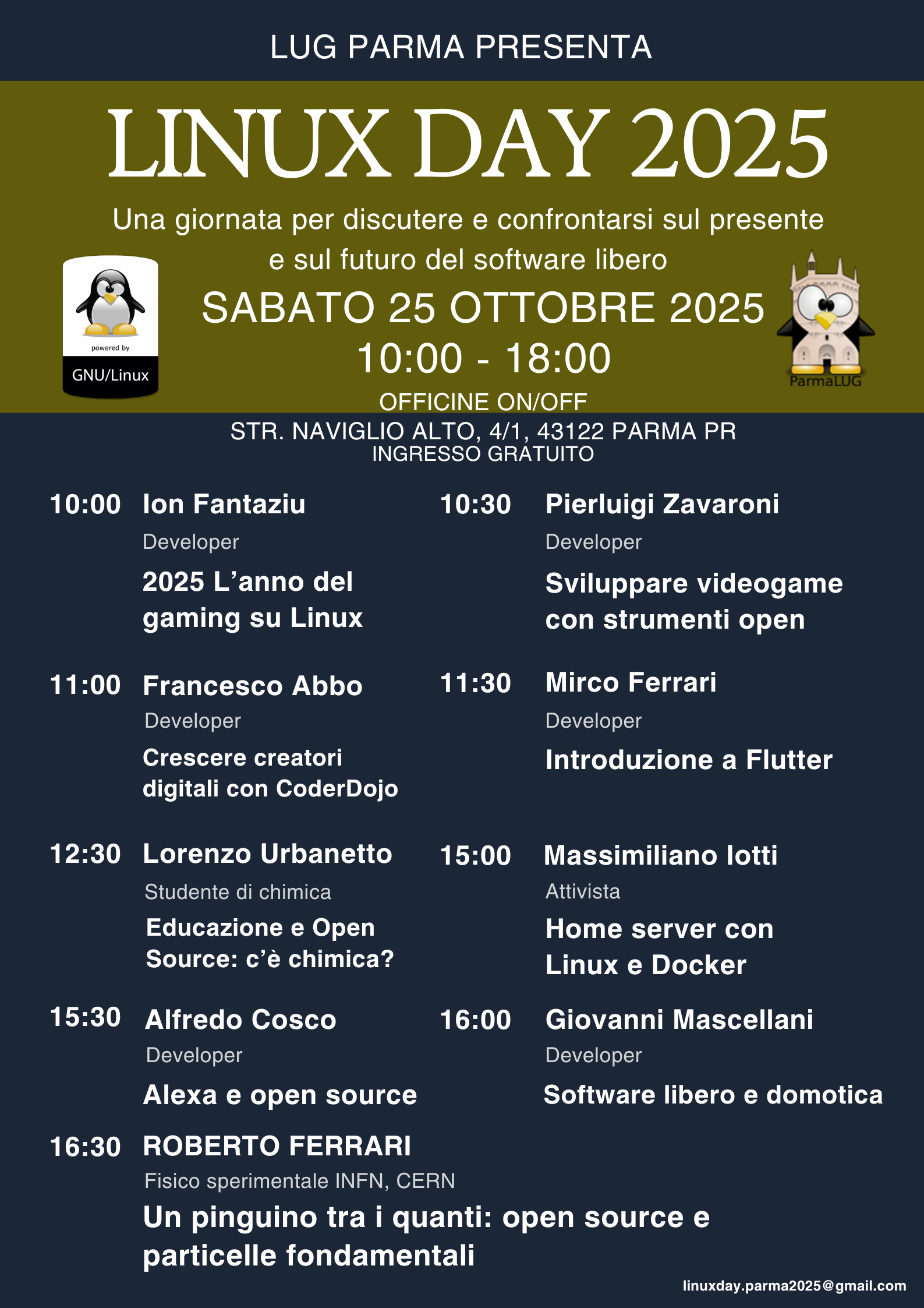 Se ne vuoi sapere di più, contattaci all'indirizzo email: linuxday.parma2025@gmail.com